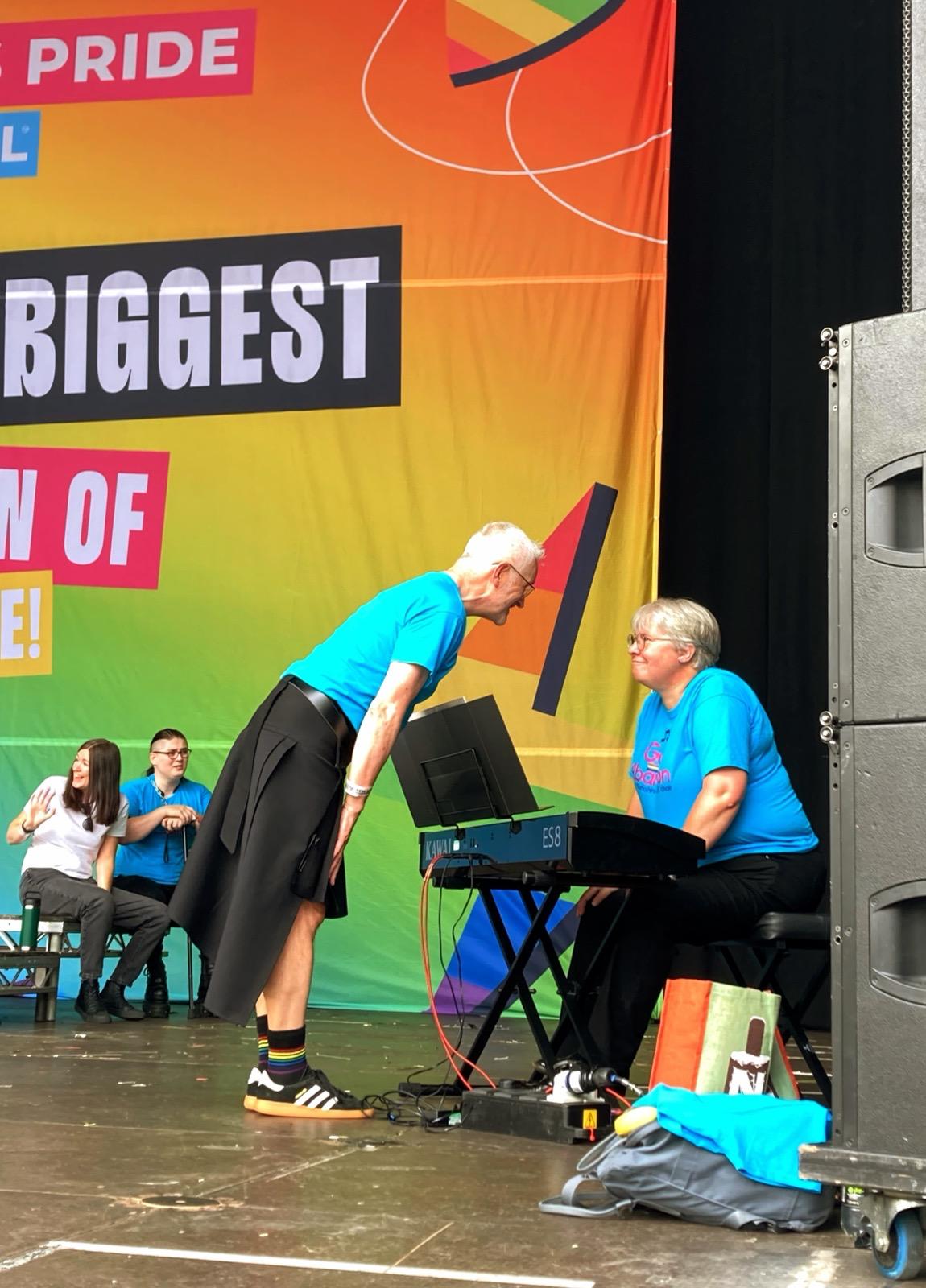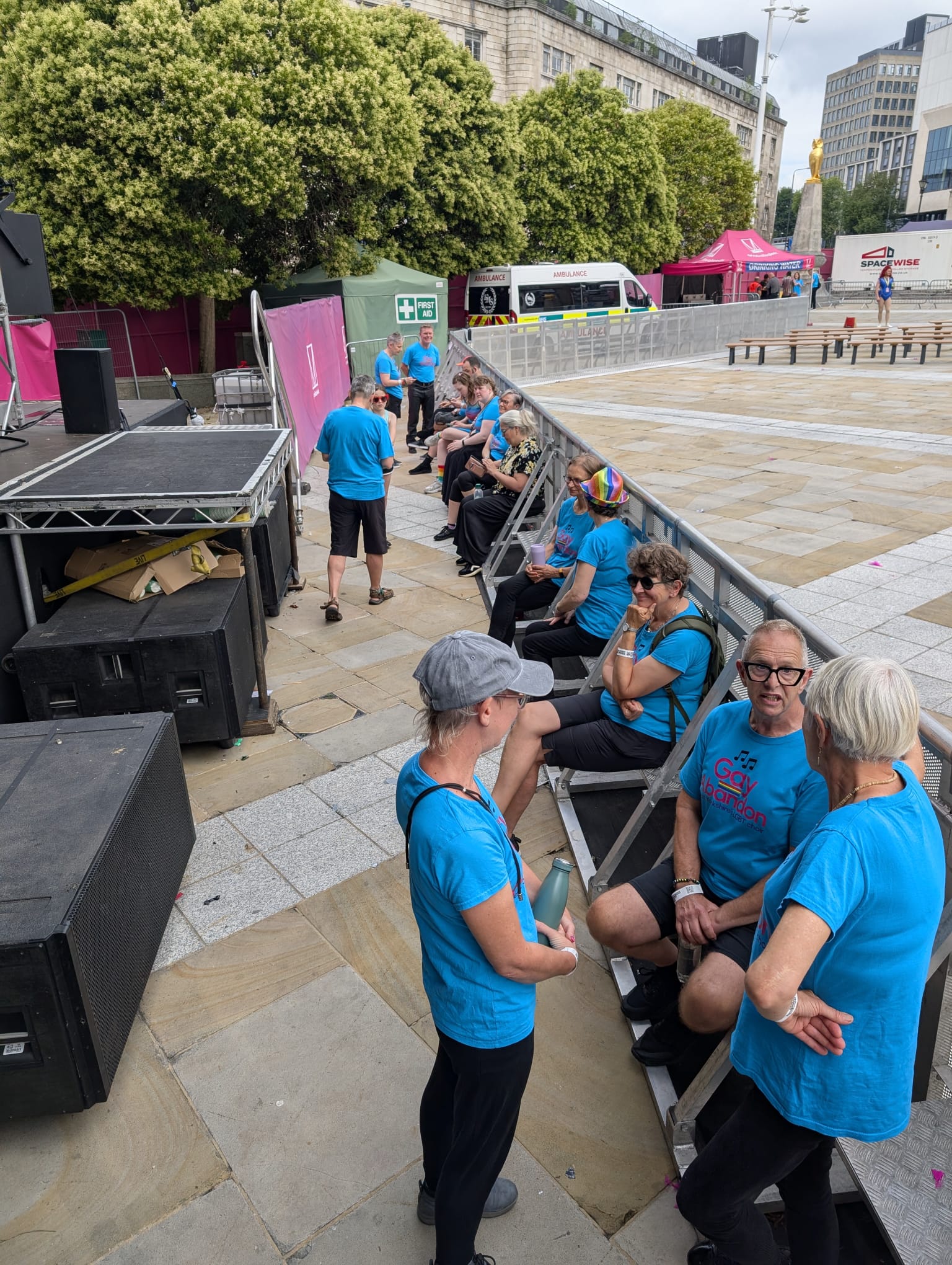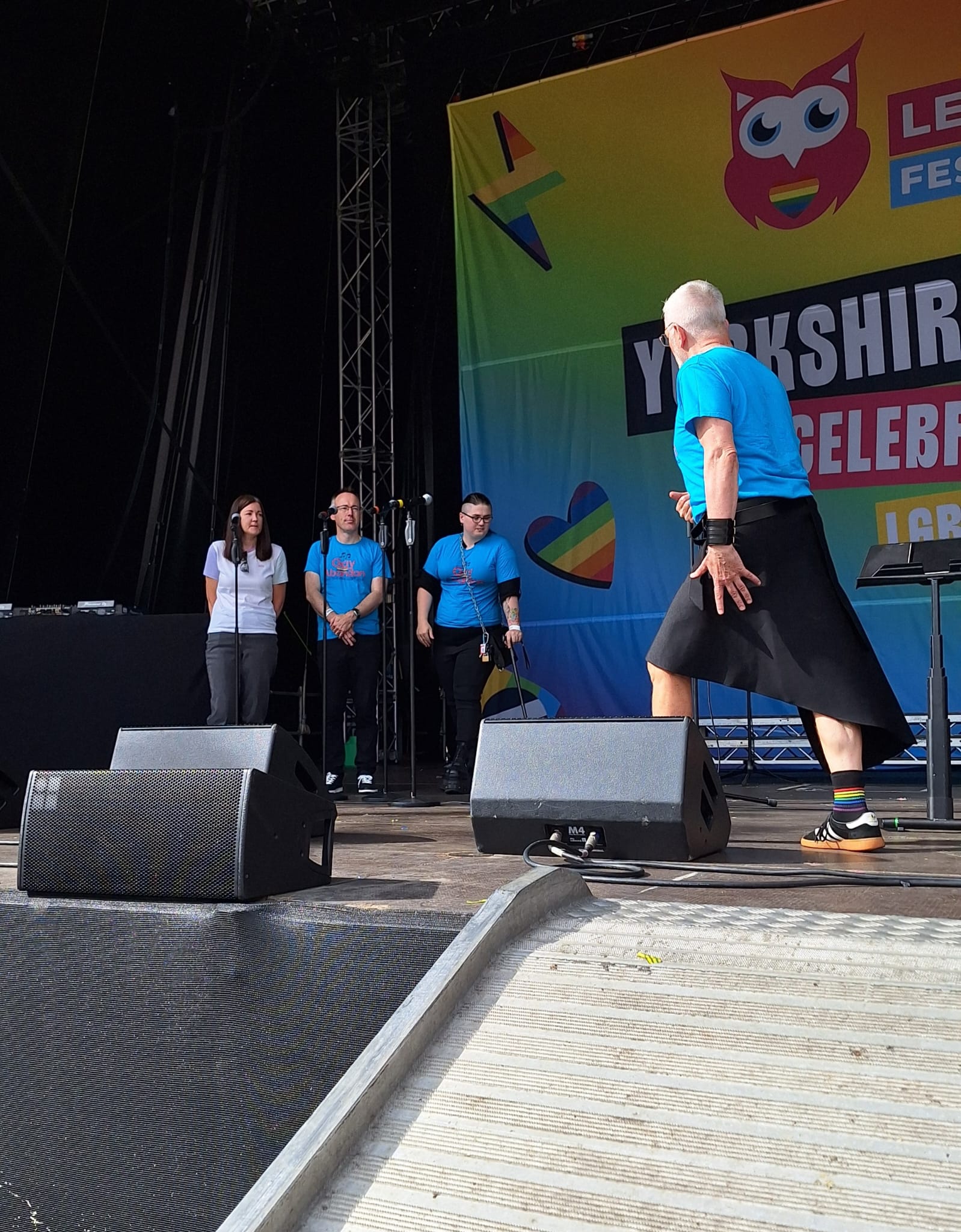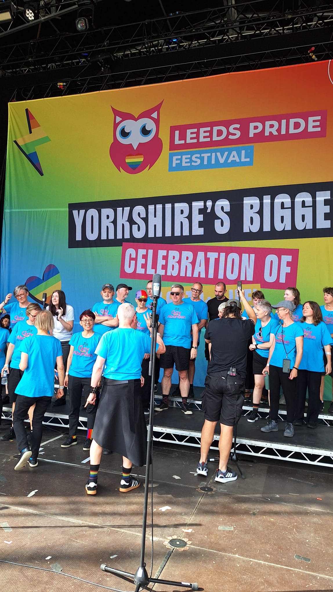 Photos from Leeds Pride 2025 when the choir performed on the main stage of Millenium square and led the parade holding the main rainbow flag